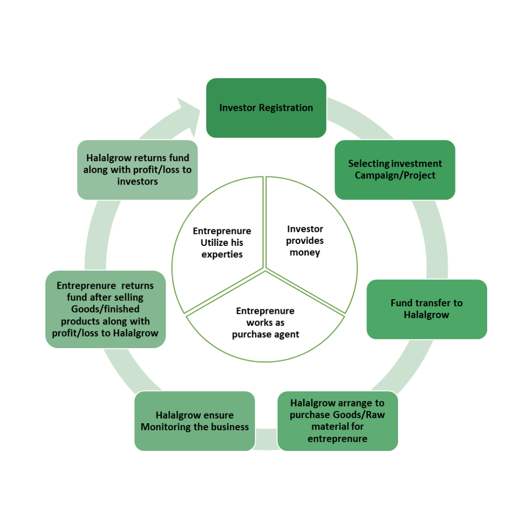 In Mudaraba, investors fund Halal business projects through HalalGrow, which manages purchasing, monitoring, and profit distribution — ensuring transparent, Shariah-compliant sharing of profit or loss between investors and entrepreneurs.